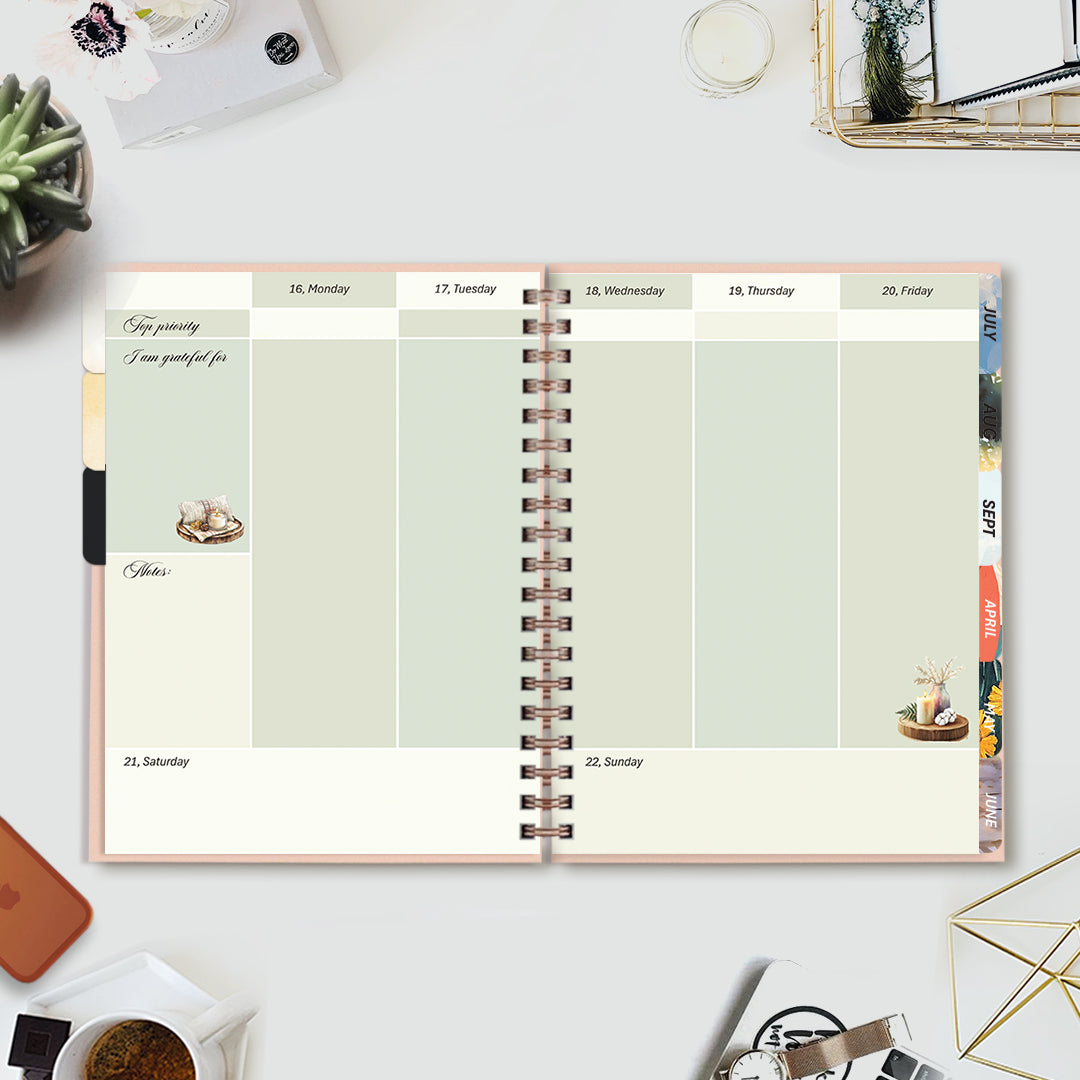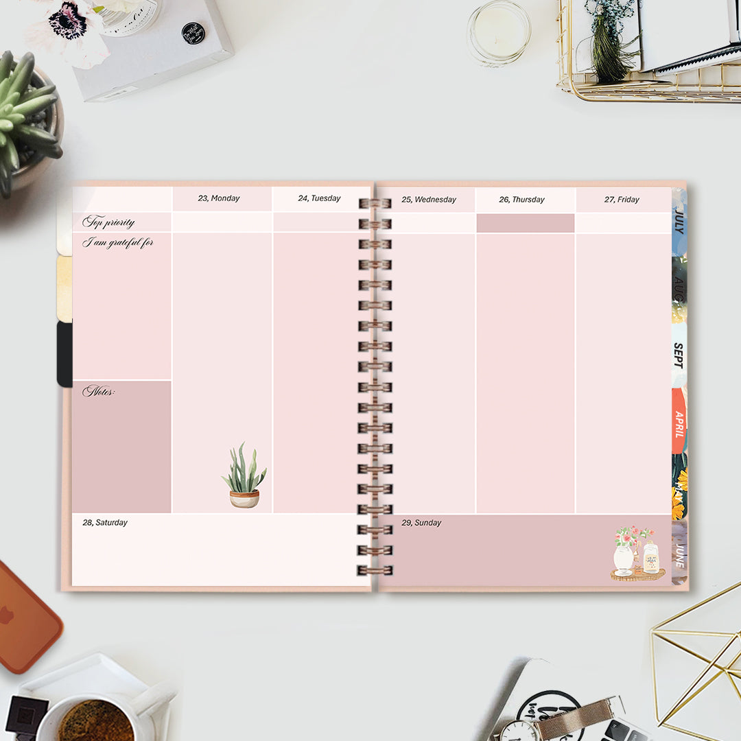- Weekly spread with day-to day to-do list, priorities, wins and lessons