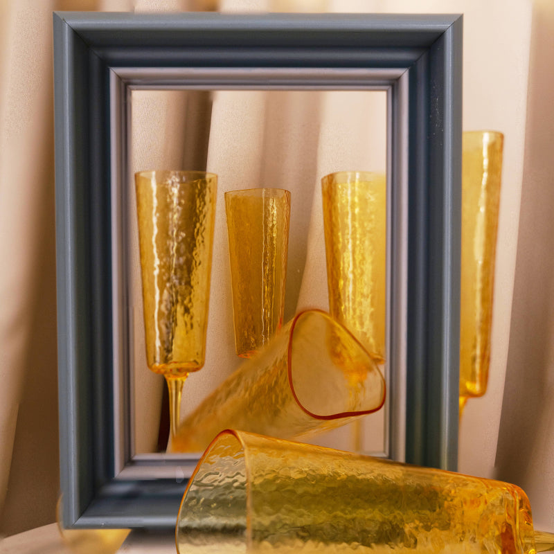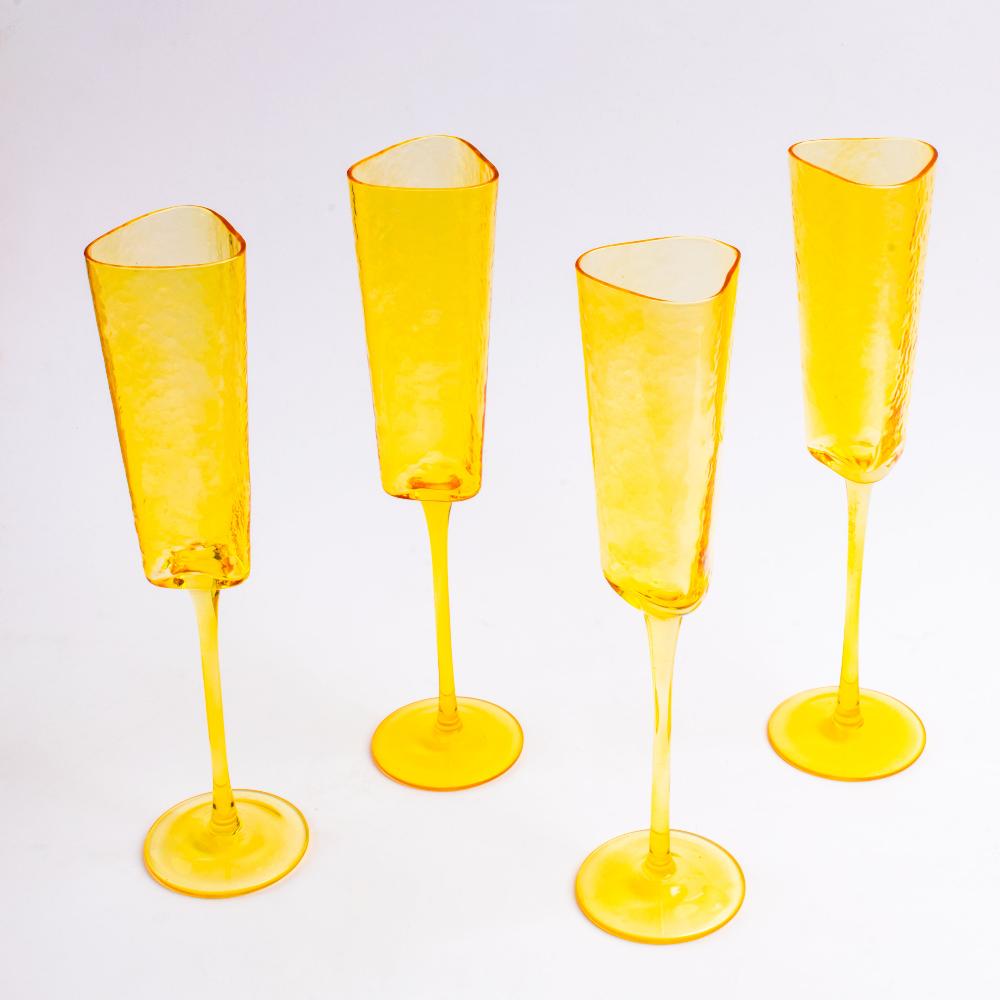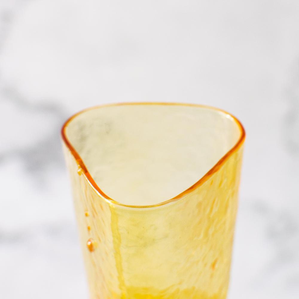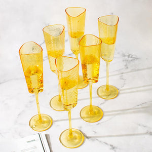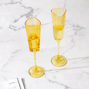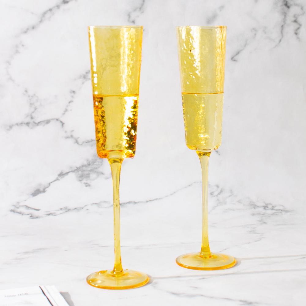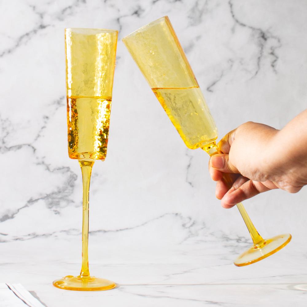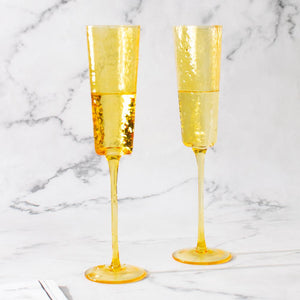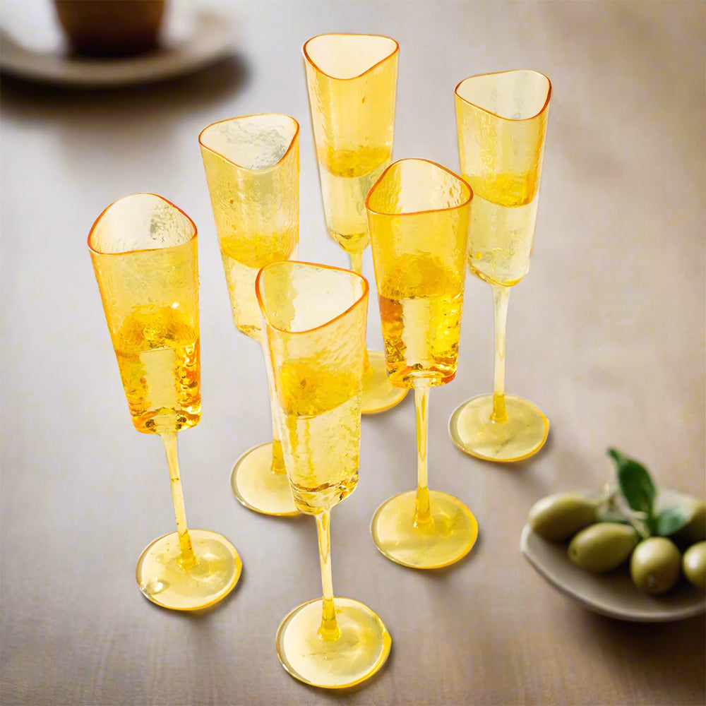 Add some whimsy to your next toast with our Amber Champagne Flute Stemware. The hammered style glass adds texture and depth, while the heart shaped design adds a touch of romance. Available in sets of 2, 4, or 6, these glasses make the perfect addition to any special occasion. Cheers to love and luxury.