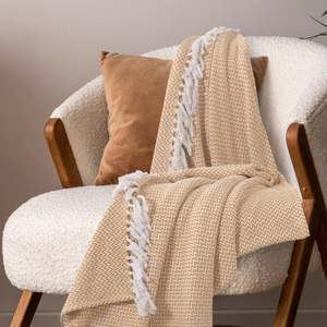 Add a cheerful and cozy touch to your living space with the Sashaa World Chevron Delight Cotton Throw. Woven in a classic yellow and ivory chevron pattern, this throw is a stylish accent piece that brings warmth, texture, and timeless charm. Whether layered over a chair, sofa, or bed, it instantly enhances the ambiance of any room. Crafted from pure cotton, it's breathable, soft, and perfect for every season—from breezy summer evenings to crisp winter mornings.
