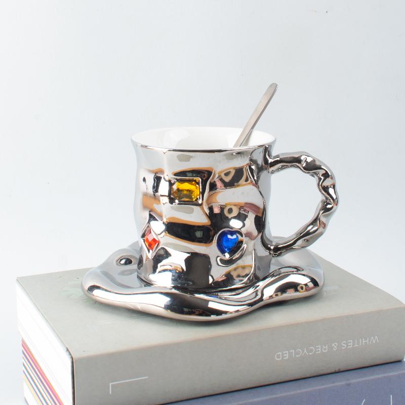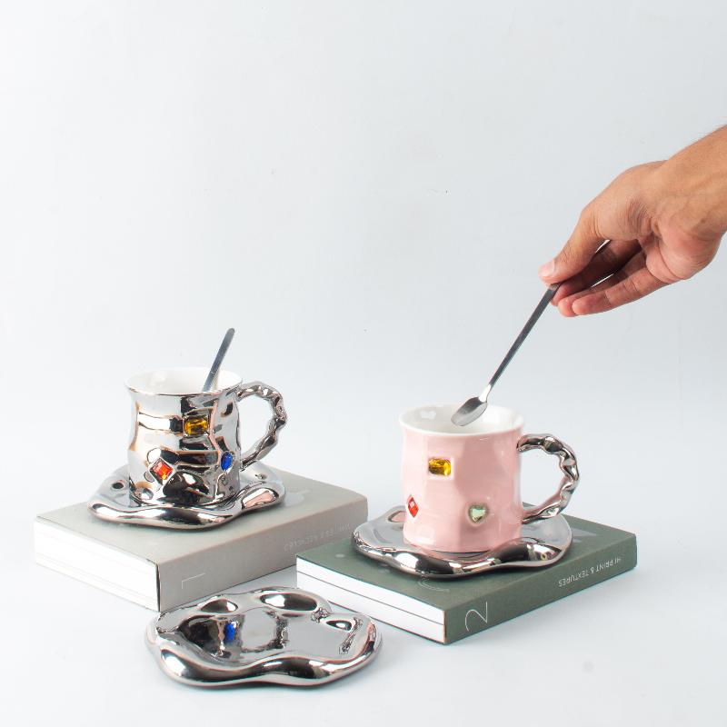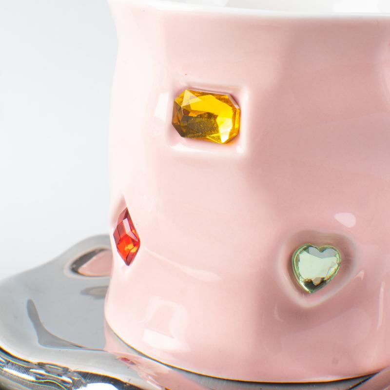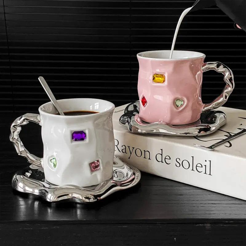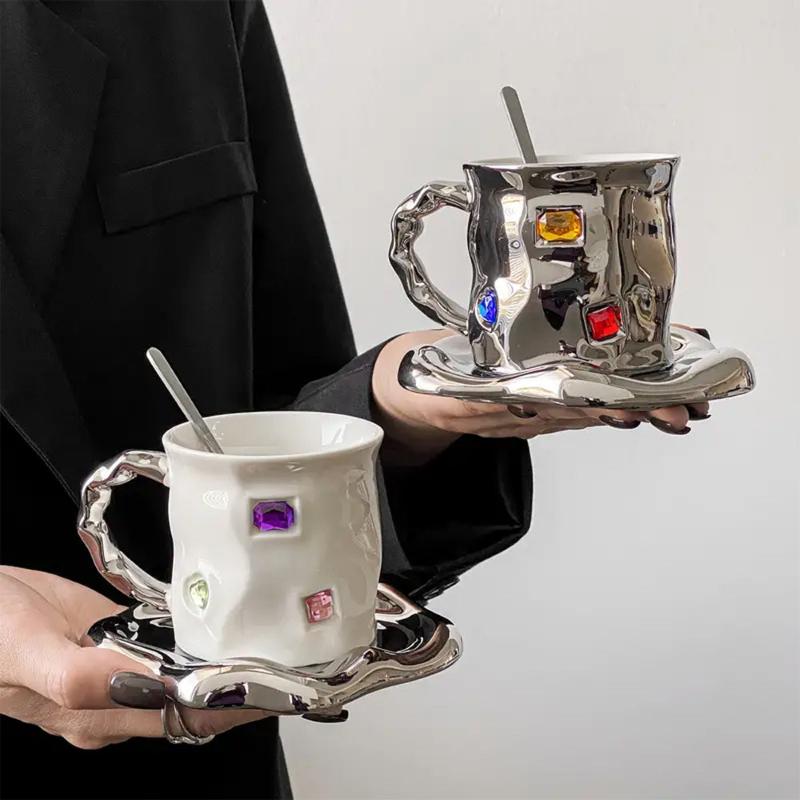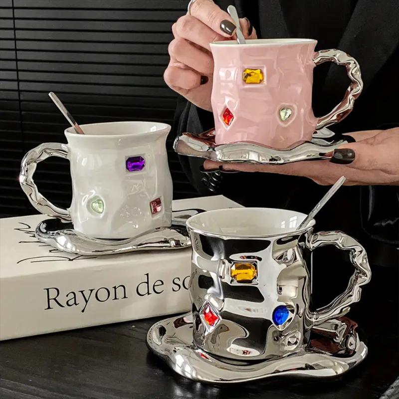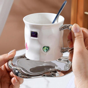 Add some elegance to your tea and coffee time with our Gemstone Elegance Cup! Made of ceramic, this cup comes with a matching plate and spoon for a luxurious touch. Perfect for your morning ritual or a relaxing afternoon break. Sip in style!