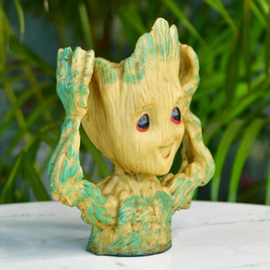 This handcrafted Groot figurine features an animated pose with both hands raised, offering a playful yet functional planter design.