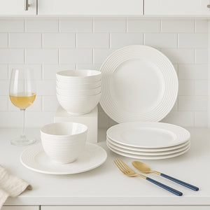 An Orphic Ivory White Set Of 12 (6 Dinner Plates + 6 Bowls) to ensure your crockery collection is on point. This premium set comes with different sizes of bowls, and dinner plates. Set the table with this dinnerware set when you are hosting a get-together. This dinnerware set is a great gifting option.