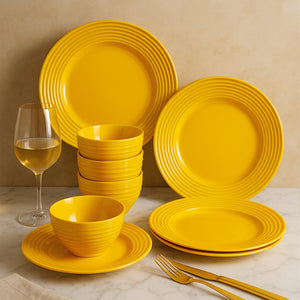 An Orenda Mustard Yellow Set Of 12 (6 Dinner Plates + 6 Bowls) to ensure your crockery collection is on point. This premium crockery set comes with different sizes of bowls, and dinner plates. Set the table with this premium dinnerware set when you are having a party or a small get-together. This ceramic dining set consists of 6 big bowls, and 6 plates in a beautiful yellow shade. This 12-piece serve ware set will adhere to all your kitchenware and tableware needs. You may use the bowls and plates to main course and even snacks. The serveware set will meet all your needs while catering to a small house party. This premium ceramic dinnerware is a great gifting option for a housewarming party, anniversary party, Diwali party or a wedding ceremony.