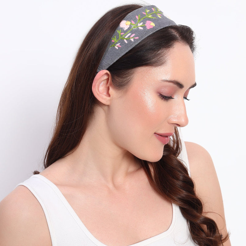 Elevate your hair accessories collection with this hand-embroidered floral headband in a sophisticated charcoal grey shade. Featuring delicate pink and white blossoms with green vine detailing, this headband exudes a blend of elegance and charm. Made with high-quality fabric, it offers a comfortable and secure fit, making it perfect for everyday wear, casual outings, or special occasions. Whether paired with a chic outfit or a cozy ensemble, this floral beauty adds a touch of timeless grace to your look.