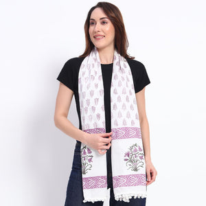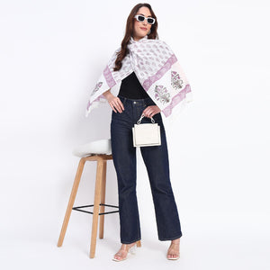 Grace meets charm with this beautifully designed stole in soft hues of lavender and white. Delicately adorned with intricate floral motifs and bordered by a sophisticated pattern, it exudes elegance and versatility. Perfect for any occasion, this piece adds a refined touch to your wardrobe with its timeless appeal.