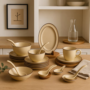 The soothing tone of our Orphic Beige 36 Piece Luxury Dinner Set adds an appetizing feel to every meal. The glazed ceramic in a sophisticated beige tone brings warmth to your tablescape. Set the table with this premium dinnerware set when you are having a party or a small get-together. This ceramic dining set consists of 6 Dinner Plates, 6 Starter Plates, 6 Bowls, 2 Serving Bowls, 2 Serving Trays, 6 Dip Bowls, 2 Serving Spoons, and 6 Spoons in a gorgeous tone. This 36-piece serve ware set will adhere to all your kitchenware and tableware needs. If you are a crockery lover this dinnerware set is sure to delight you.