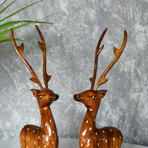 Unique Design: A serene pair of wooden deer sculptures, elegantly posed in a sitting position, symbolizing peace, grace, and gentleness.