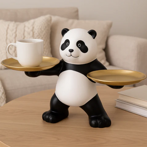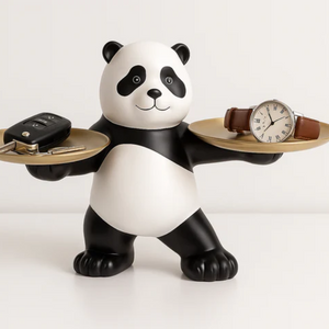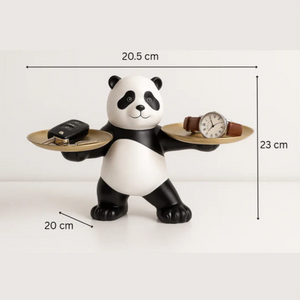 A charming panda-shaped dual tray holder designed for both utility and décor. Crafted from durable resin with smooth matte finishing, the panda’s hands hold two golden trays that can be used for organizing keys, watches, spectacles, jewelry, or small desk accessories. The combination of black-white resin and metallic gold adds a luxurious yet playful touch to modern interiors.