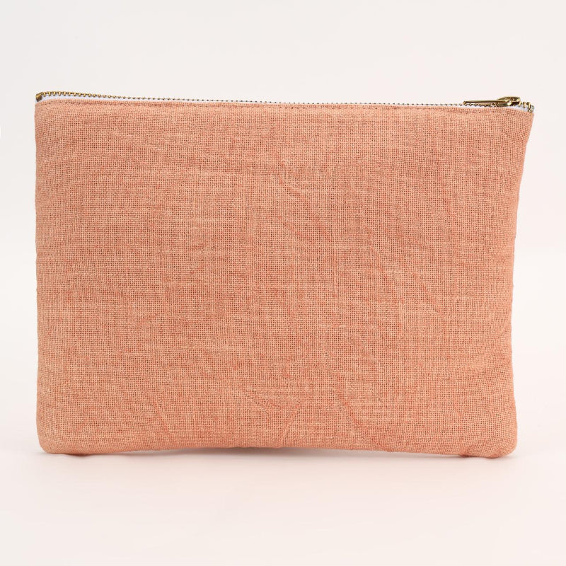 This elegant pouch has a soft peachy background, beautifully adorned with vibrant floral embroidery. The intricate design features white daisies, pink blooms, and golden yellow flowers, giving it a cheerful and natural aesthetic. Its zipper closure ensures functionality while maintaining its stylish appeal. This pouch is ideal for storing makeup, small accessories, or everyday essentials, making it practical and fashionable. Its delicate embroidery adds a touch of artisanal charm, making it a perfect gift.
