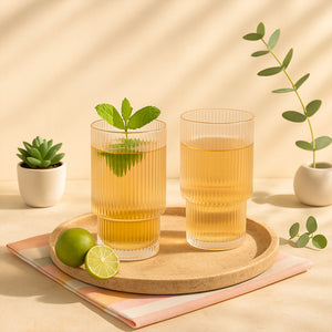 A Ribbed Glass Carafe Small (Set of 2) is intricately crafted to enhance the look of your dining table set up. This drinkware set will compliment all your serve ware. The well-designed glass will be perfect to pair it with your serveware at dinner, brunch or lunch. The ribbed effect along with the matte texture will bring elegance to your table. Sip on hot beverages like milk, coffee, tea, or ice-cold drinks such as iced-tea, cold coffee, soft-drinks, cocktails or mocktails in this well-designed glass.