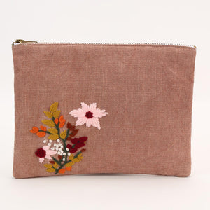 This pouch features a soft, earthy brown fabric adorned with delicate floral embroidery in vibrant hues of pink, orange, and red. The intricate hand-embroidered design adds an elegant touch, making it a perfect blend of minimalism and artistry. Compact and stylish, it is ideal for storing essentials such as cosmetics, stationery, or small personal items. Its sturdy zipper ensures security, while the textured fabric offers a comfortable, rustic charm. A versatile piece, it can seamlessly complement any outfit or occasion.