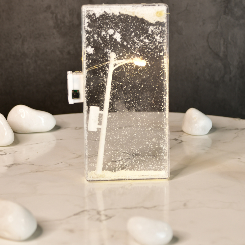 Experience the magic of winter with the Sowpeace Snowy Glow DIY street lamp showcase. Designed to replicate a snowy evening, this elegant lamp features a water-filled chamber with falling snowflakes, illuminated by a soft, warm light. Whether used as a holiday decoration, a cozy night lamp, or a creative DIY project, it brings a sense of wonder and nostalgia to any space.