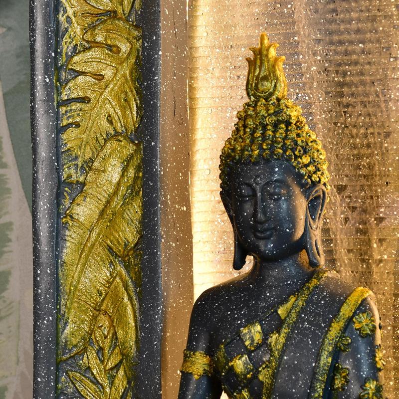Unique Design: Golden Buddha water fountain featuring an elegant Buddha sitting against a tall wall with a soothing waterfall, adding a touch of luxury and tranquility to any space.