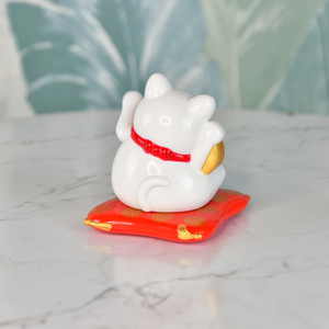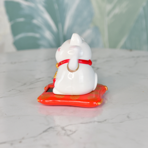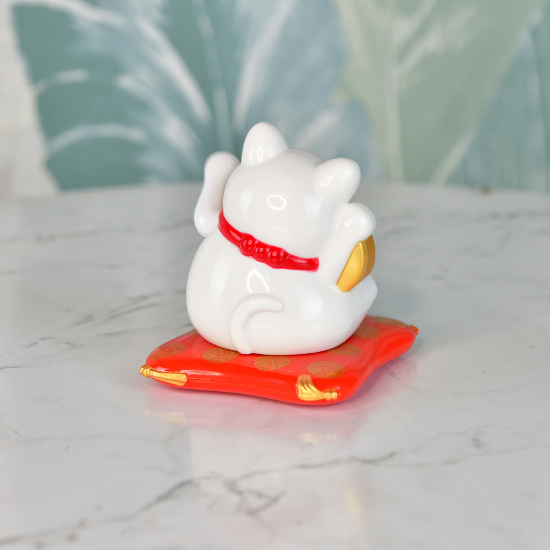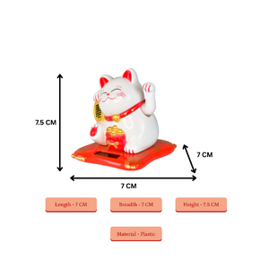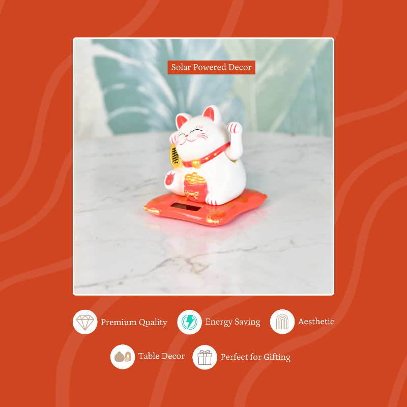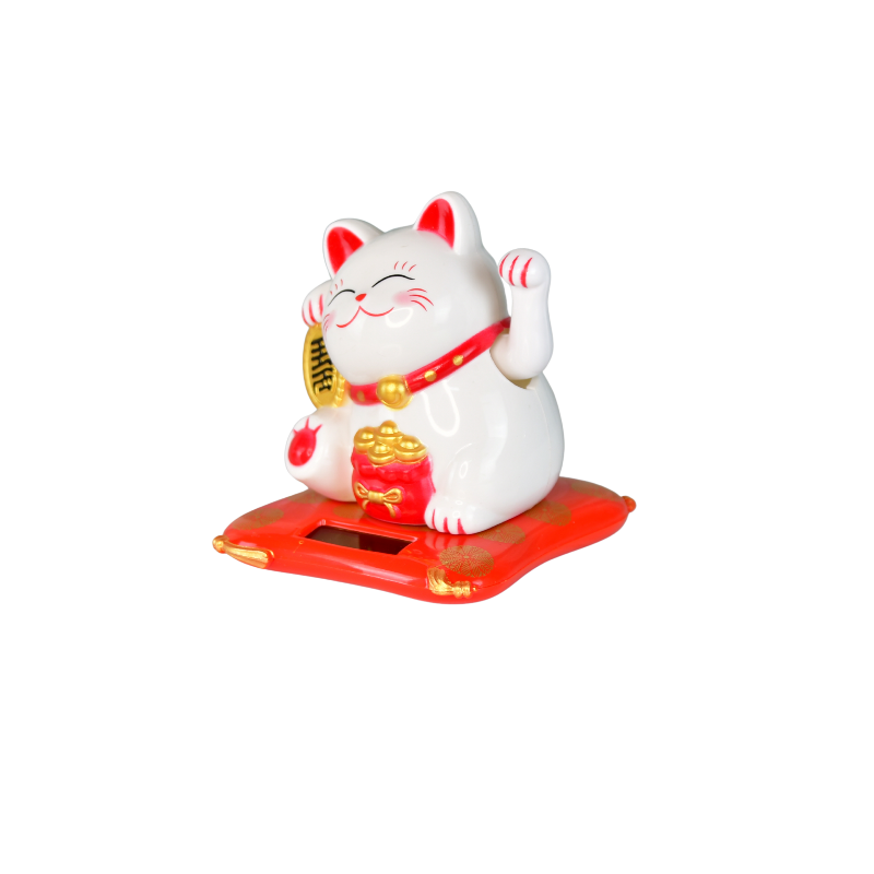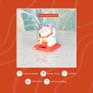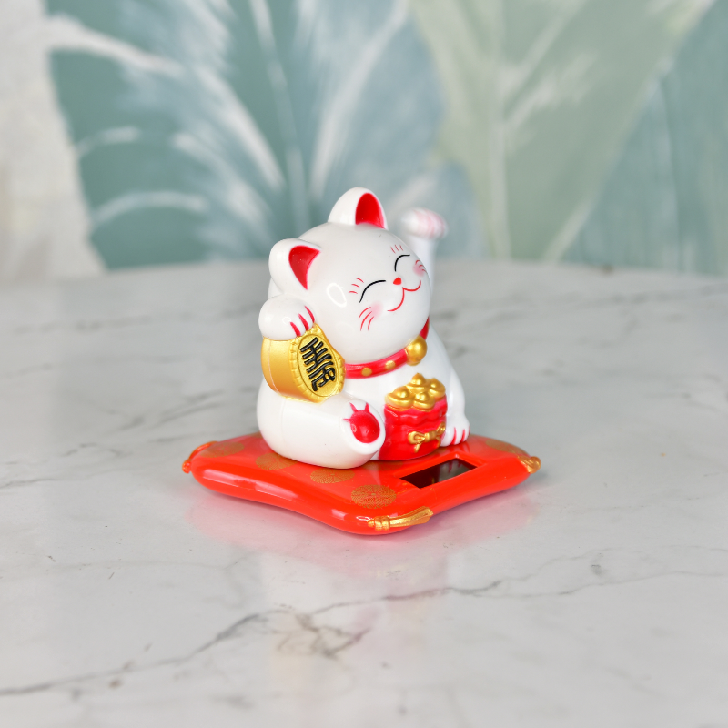 Invite prosperity and joy with this Solar Powered Maneki-neko. A classic white lucky cat figurine that waves its paw using light energy, making it a perfect unique home decor item or car accessory.