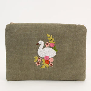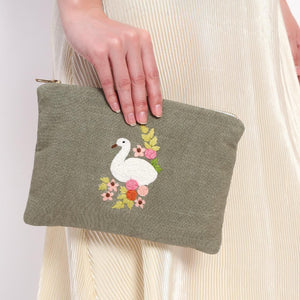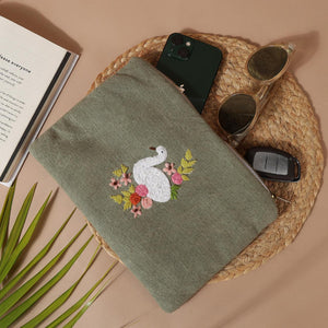 This elegant olive-green pouch features a graceful embroidered swan surrounded by delicate floral accents in soft pink, peach, and yellow hues. The serene design evokes a sense of calm and sophistication, perfect for those who appreciate understated beauty. Compact yet spacious, it is ideal for organizing your daily essentials while adding a refined touch to your accessory collection. The combination of earthy tones and intricate embroidery makes it a timeless piece.