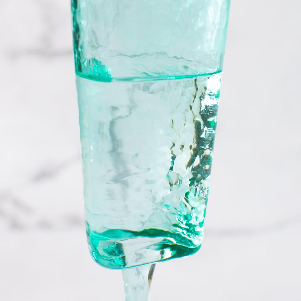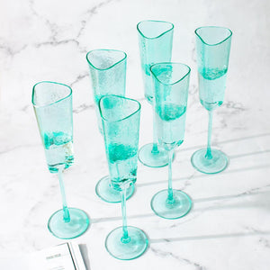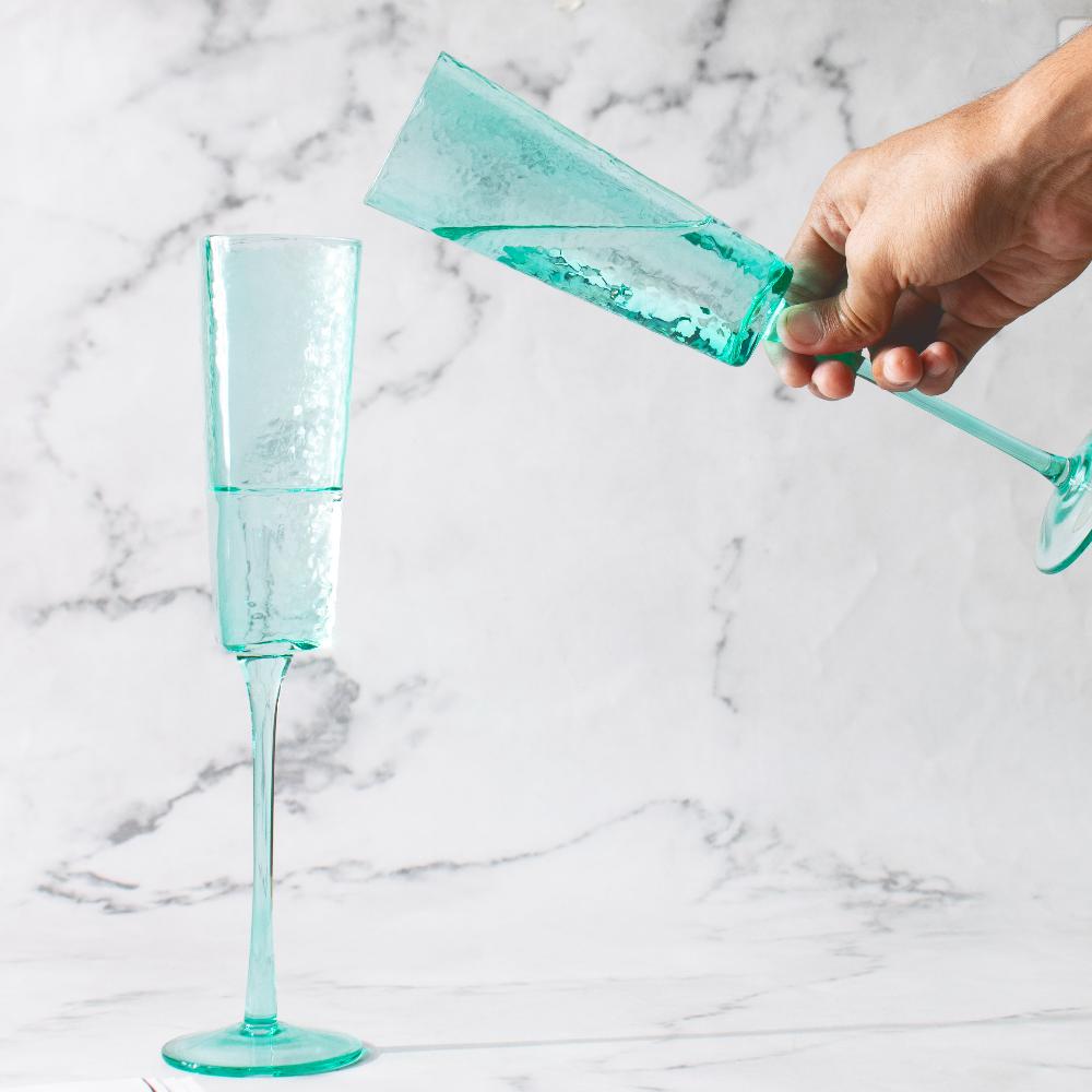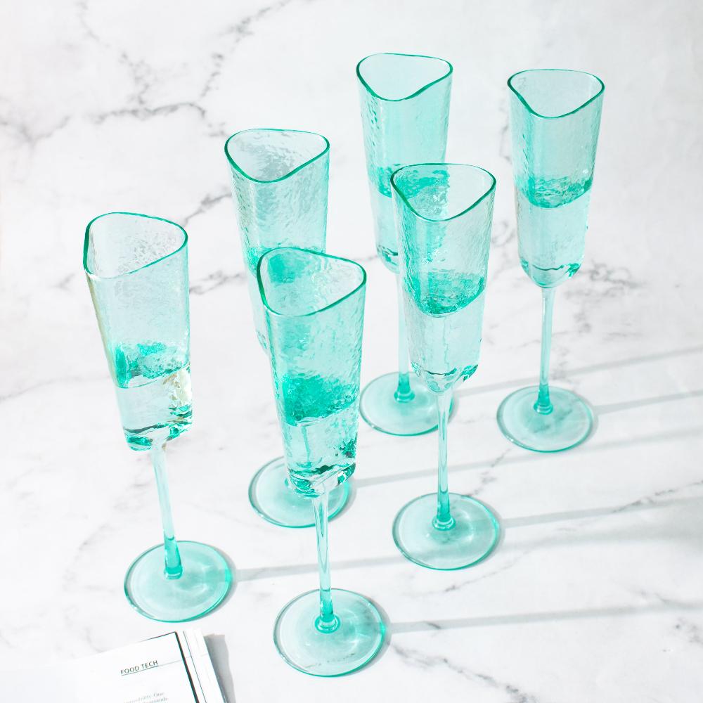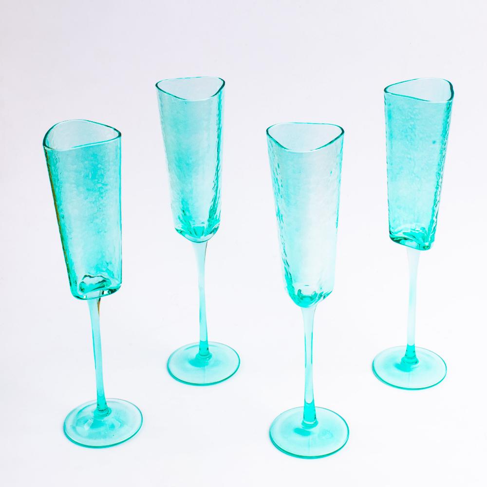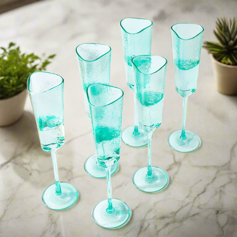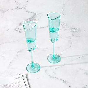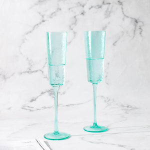 Add some whimsy to your next toast with our Turquoise Champagne Flute Stemware. The hammered style glass adds texture and depth, while the heart shaped design adds a touch of romance. Available in sets of 2, 4, or 6, these glasses make the perfect addition to any special occasion. Cheers to love and luxury.