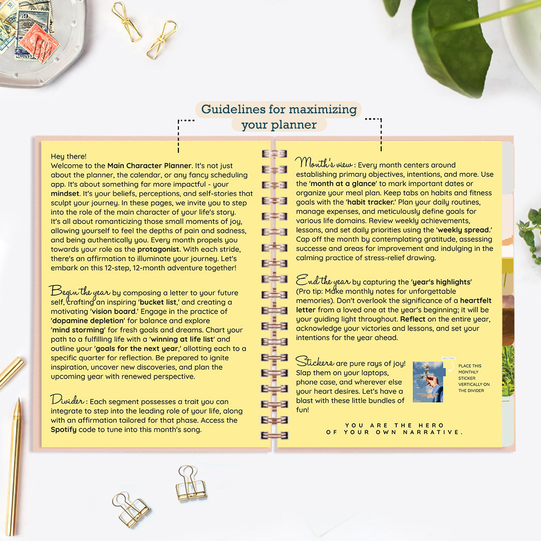Our Undated Planner collection is your ultimate canvas for unlocking your inner main character. These planners are your trusty buddies, and each page is a blank slate waiting for your journey and goals. No more waiting around for that "perfect" date – the spotlight is always yours to take. With themes and inspiration that groove with your ever-evolving story, it's time to grab that pen and start scripting your narrative, your way, every single day. Let's make your story awesome!