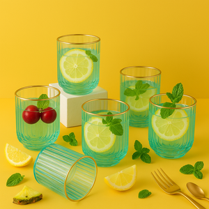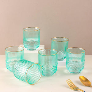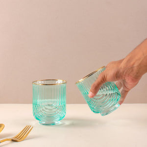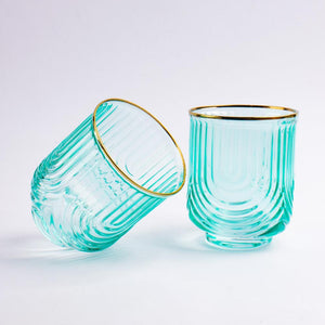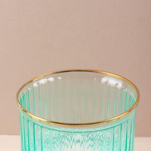 Indulge in luxury with our Verdant Gilded Wave Glass set. The ribbed glass texture and golden rim add a touch of elegance to your drinkware collection. Crafted with premium glass, these glasses are available in sets of 2, 4, or 6. Elevate your dining experience with these exclusive pieces.