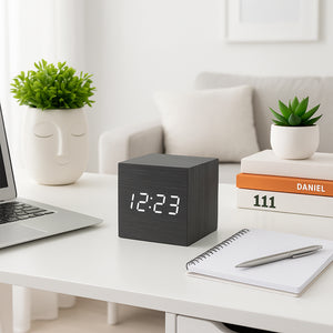 A Wooden Texture Cube Alarm Clock With Temperature Display can meet all your needs. This digital desk alarm clock with sound control is a perfect table accent and a home décor item. This clock has a 3 alarm settings, temperature and date display, and sound control. This digital wooden texture cube clock can be an ideal fit for your side table, work desk, office desk or study table. The brightness decreases in half automatically from 18:00 to 7:00 am. This portable alarm clock with a sleek look is also a great gifting option.