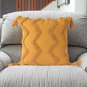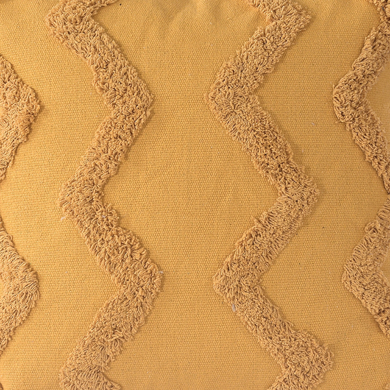 Brighten up your living space with the warm charm of the Sashaa World Chevron Tufted Cushion Cover. Crafted in a striking mustard yellow hue, this cover features a raised chevron tufted pattern that adds texture and personality to any room. Finished with tassels on each corner, it's a stylish yet comfortable addition to sofas, beds, and reading nooks. Made from 100% cotton, it offers breathable softness and lasting durability.